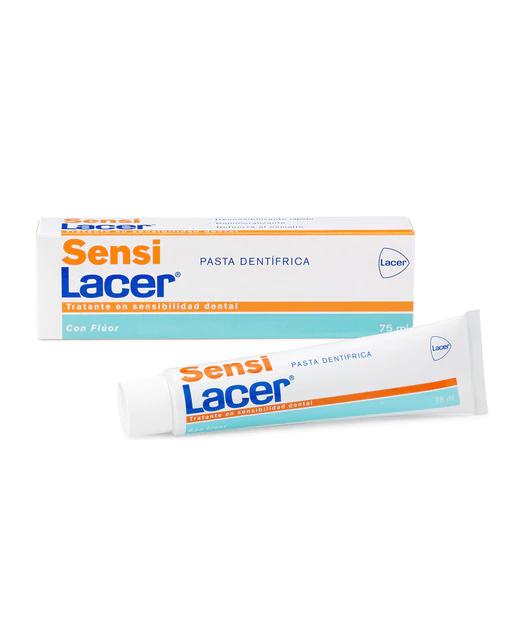SensiLacer ejerce una acción desensibilizante rápida y prolongada, que disminuye la hipersensibilidad de los dientes sensibles frente al frío, calor, dulces u otros estímulos. Contiene Nitrato potásico, que ha demostrado ser uno de los principios activos más eficaces para disminuir la sensibilidad dental. El alto contenido en Flúor, gracias a su acción remineralizadora, potencia el efecto desensibilizante, contribuye a la prevención de la sensibilidad dental y protege contra la caries. El Dióxido de Silicio Obliterante ejerce una obliteración rápida y duradera de la superficie dentinal y sus túbulos, reforzando la dentina, efecto que refuerza su eficacia, protegiendo al diente frente a los estímulos causantes de la sensibilidad dental. La fórmula de SensiLacer se completa con la inclusión de Xilitol, un tipo de edulcorante que no provoca caries y que favorece la remineralización del esmalte dental. Está especialmente indicado para la higiene bucal diaria de personas con hiperestesia dentinaria (dientes sensibles o hipersensibilidad dental), para aliviar la hipersensibilidad dental después de la limpieza bucal y/o blanqueamiento dental efectuado en Clínica Dental. También resulta idóneo después de tratamientos periodontales, en caso de retracción gingival y pérdida del esmalte ocasionada por caries o por abrasión excesiva en el proceso de cepillado.